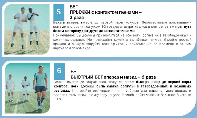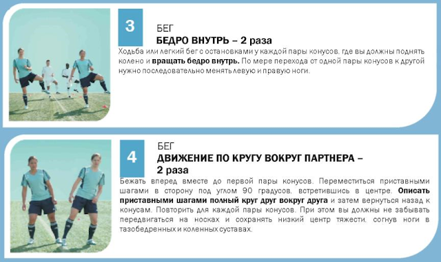 Вернемся к возрастному ограничению. ФИФА официально указывает, что полный комплекс рекомендован для выполнения юным футболистам от 14-ти лет, но речь именно о полном комплексе. Есть версия «for kids». Полагаю, что и на основе этой программы можно было бы сформировать облегченную версию и написать «для возраста 6+». Мы, например, занимаемся по сокращенному варианту: 6 пар фишек расставлены друг от друга на 2,5-3 метра, упражнения второго блока выполняем по одному разу, и совсем не делаем 10-е (на координацию с мячом в руках) и 14-е (бег прыжками) упражнения.